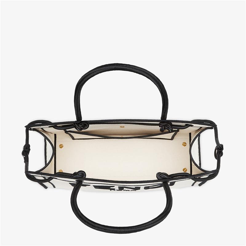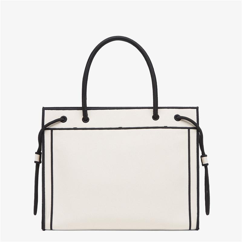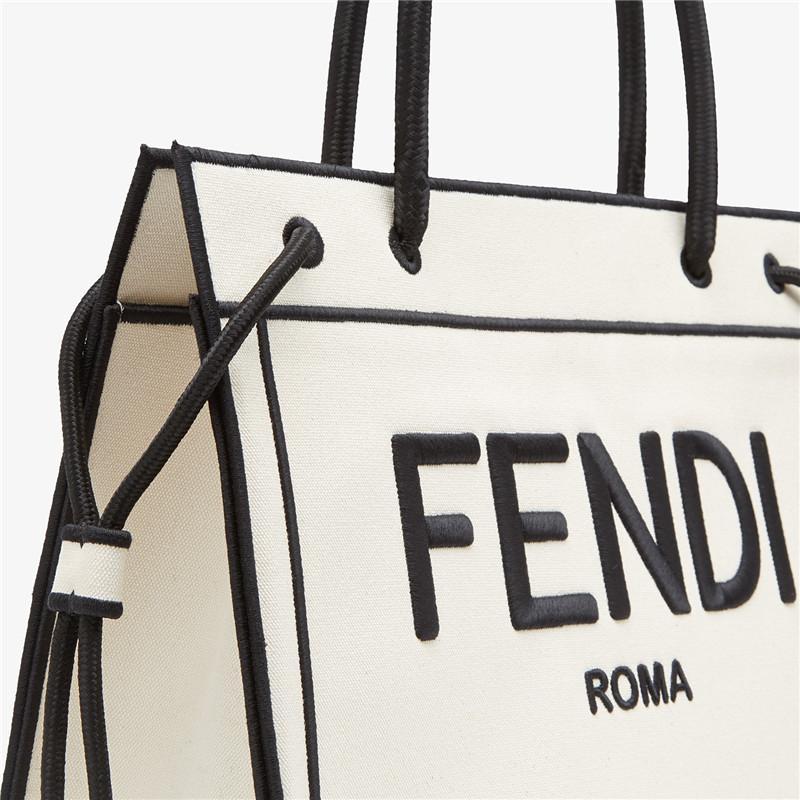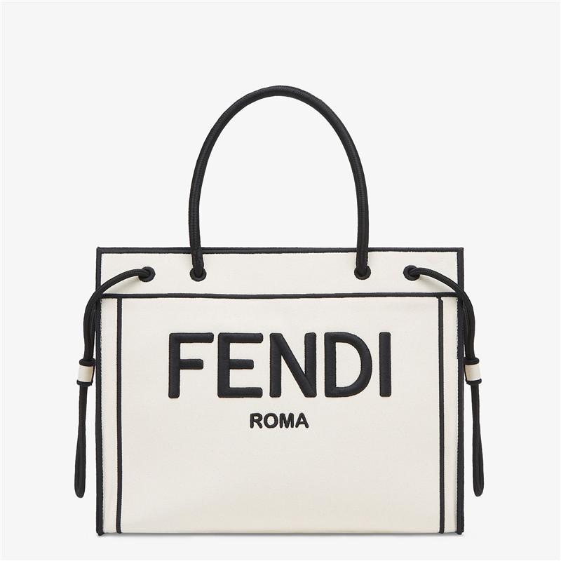 ナチュラルカラーのファブリックを使用した、ミディアムサイズのFENDI ROMAショッパーバッグ。コントラストの映えるブラックの糸で刺繍を施した、縁と「FENDI ROMA」のレタリング。ライニングの付いていない、ポケットを備えた容量にゆとりのあるコンパートメント。ブラックのロープ製のハンドルを2本備えているので、ハンドバッグとして活躍します。幅:35.5cm x 高さ:27 cm xマチ:12 cmハンドルからバッグまでの高さ:17cmイタリア製