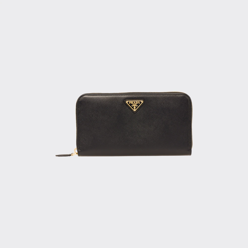 端に丸みのある「サフィアーノ」カーフ(牛革)財布。ファスナー付札入れ1個、カードホルダー12個、ドキュメントポケット6個、ファスナー付小銭入れ1個。PRADAロゴ入り。ファスナー開閉式。