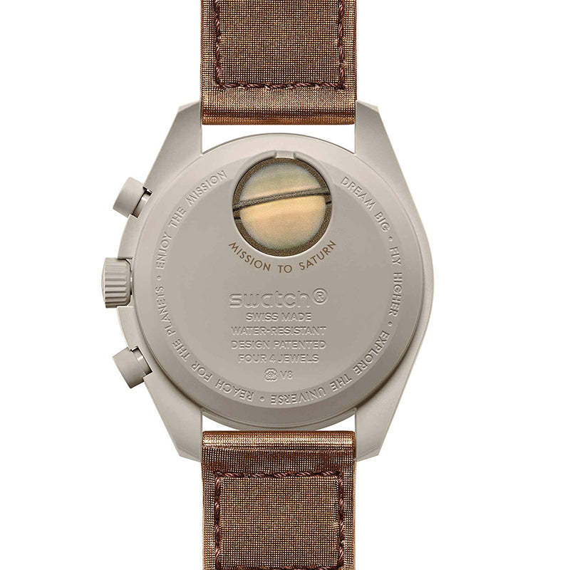 このモデルでは、サンドベージュのトーンがブラウンの文字盤やVELCRO©ストラップと見事なコントラストをなしています。クロノグラフの秒針、サブダイアルの針、タキメーターの目盛の背景もブラウン。秒のサブダイアルには土星の環が描かれています。 すべての文字盤には、OMEGA X SWATCHの文字、アイコニックなSpeedmasterのロゴ、そして新しいMoonSwatchのロゴが見られます。ガラス構造にはクリスタルの中央に隠れたSの字が統合。文字盤の外側のリングとサブダイアルには繊細で洗練された円の模様、シャープでスムーズなラグ構造、タキメーターの目盛が付いたベゼルにはアイコニックな「ドットオーバー90」のディテール、そしてもちろんユニークなBioceramicのタッチ。これらが全モデルに共通で、ディテールを愛する情熱を表わしています。すべての時針、分針、クロノグラフの秒針、そして時間のマーカーにスーパールミノバが施されているので、暗闇でパーフェクトに光ります。